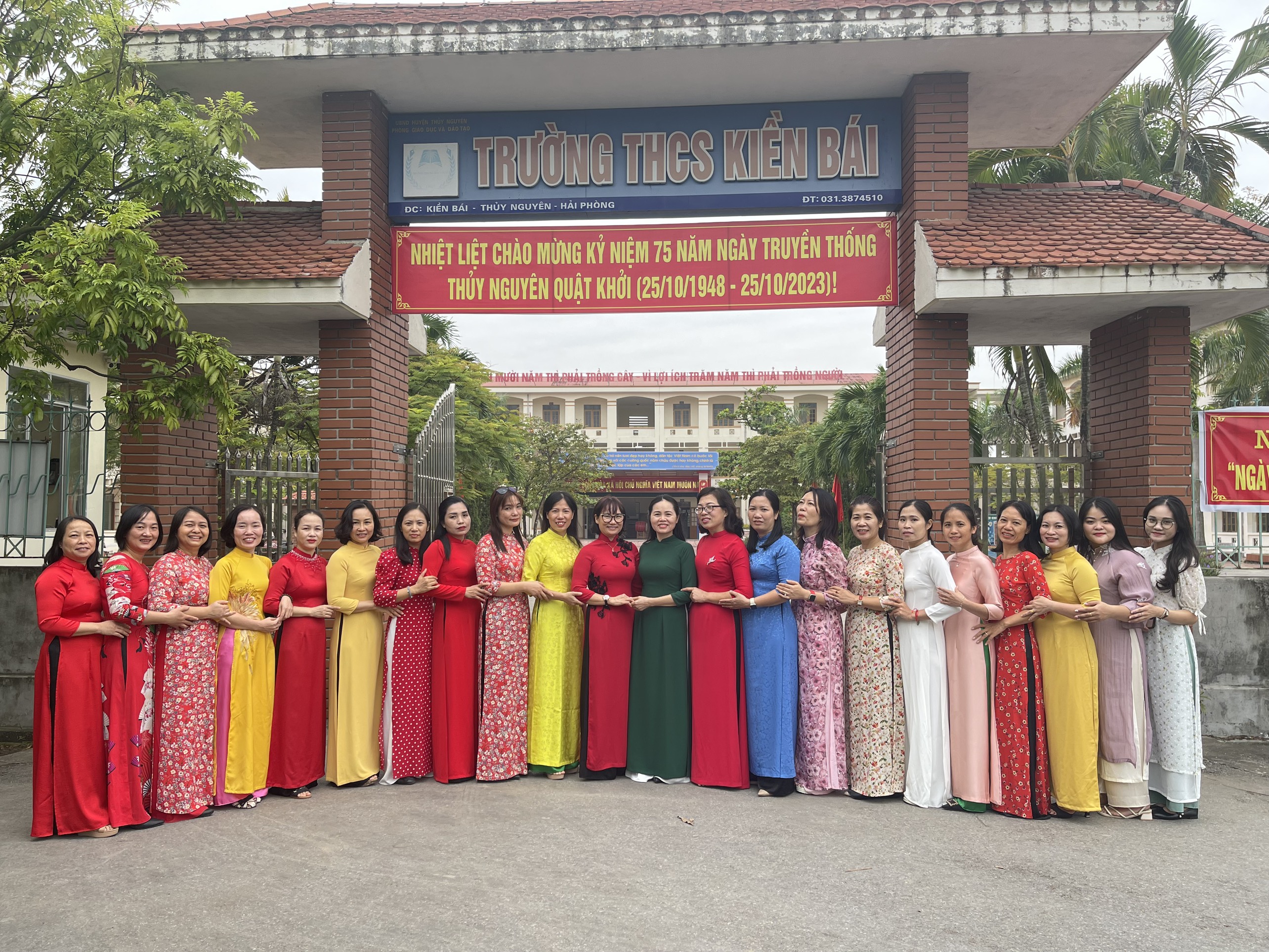 Hưởng ứng phát động của LĐLĐ Huyện Thuỷ Nguyên, đồng thời chào mừng kỷ niệm 93 năm ngày thành lập Hội LHPN Việt Nam (20/10/1930 - 20/10/2023), chào mừng Đại hội XV Công đoàn thành phố nhiệm kỳ 2023-2028 Công đoàn trường THCS Kiền Bái đã phát động tuần lễ mặc áo dài. Đoàn viên công đoàn đã thực hiện mặc áo dài khi làm việc lại cơ quan, công sở để lan toả vẻ đẹp của áo dài. Khơi dậy trách nhiệm gìn giữ, phát huy di sản văn hoá Việt Nam.