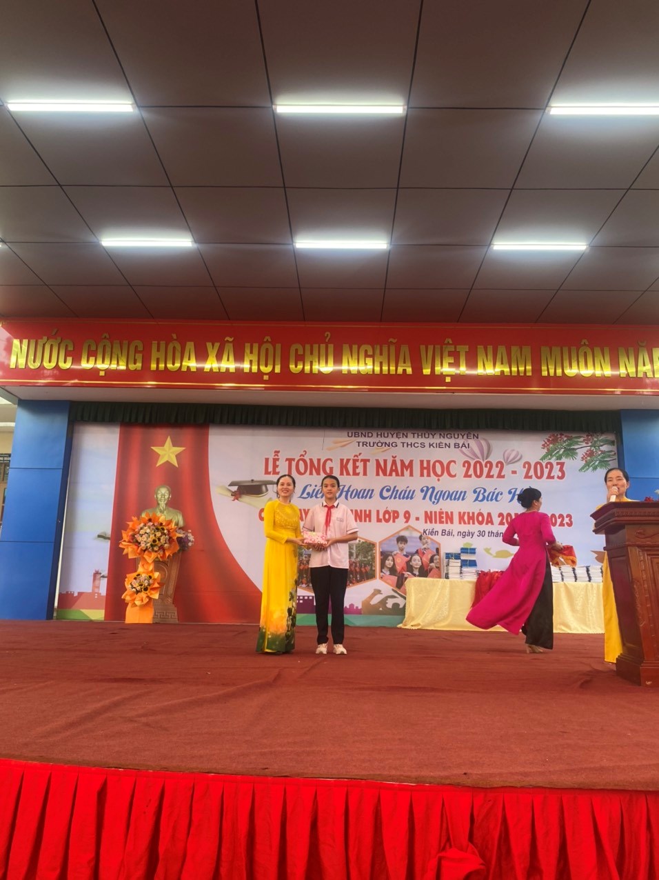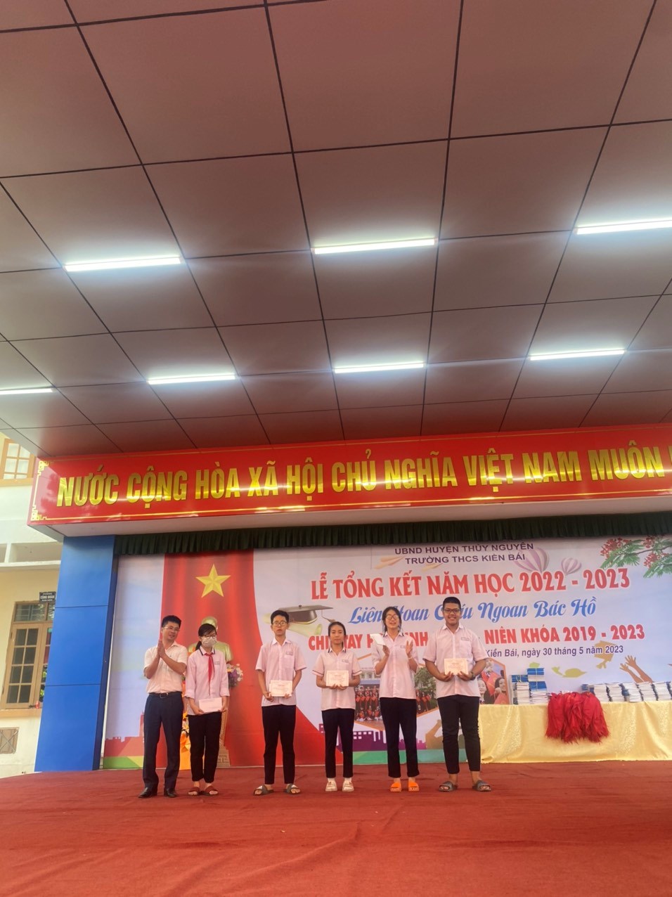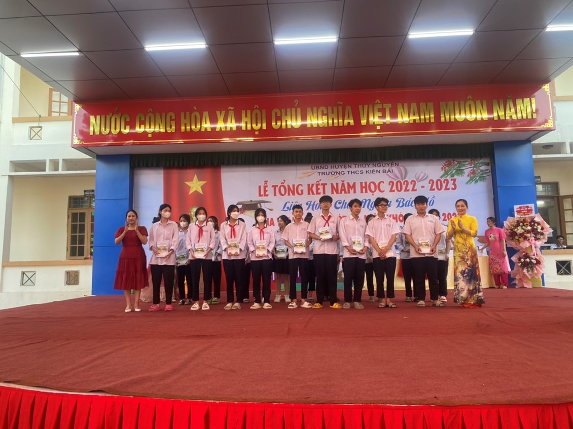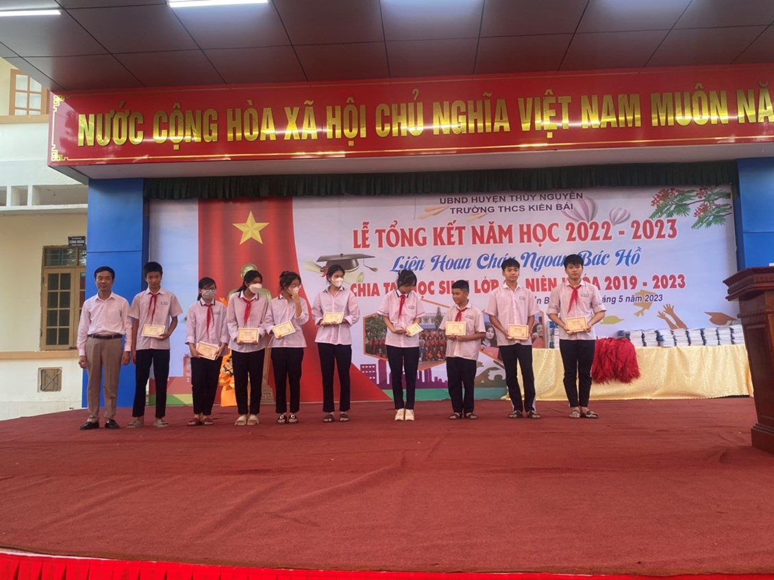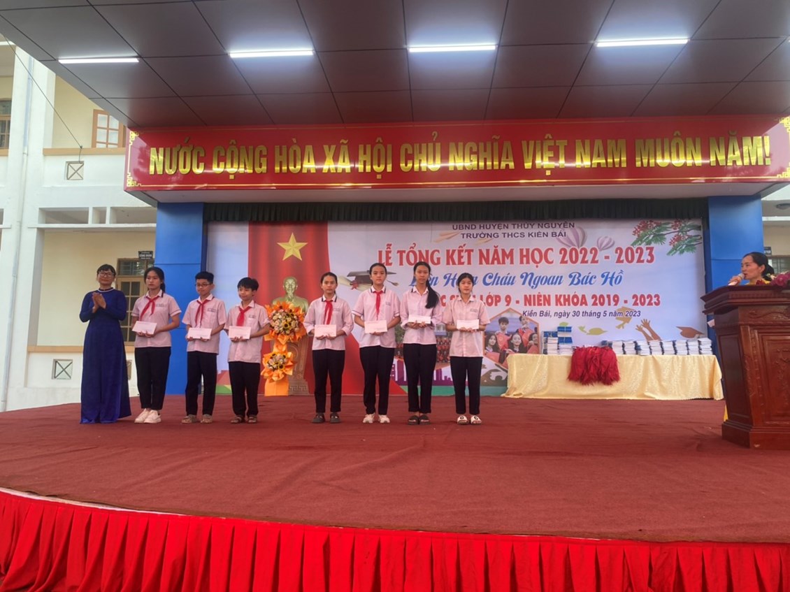 Ngày 30/5/2023 -Trường THCS Kiền Bái long trọng tổ chức Lễ tổng kết năm học- Liên hoan Cháu ngoan Bác Hồ- Chia tay học sinh khối 9 niên khóa 2019-2023 năm học 2022-2023 để báo công lên Bác, báo cáo với các cấp lãnh đạo, với phụ huynh về thành quả công tác và học tập không ngừng nghỉ của học sinh nhà trường trong một năm học vừa qua.